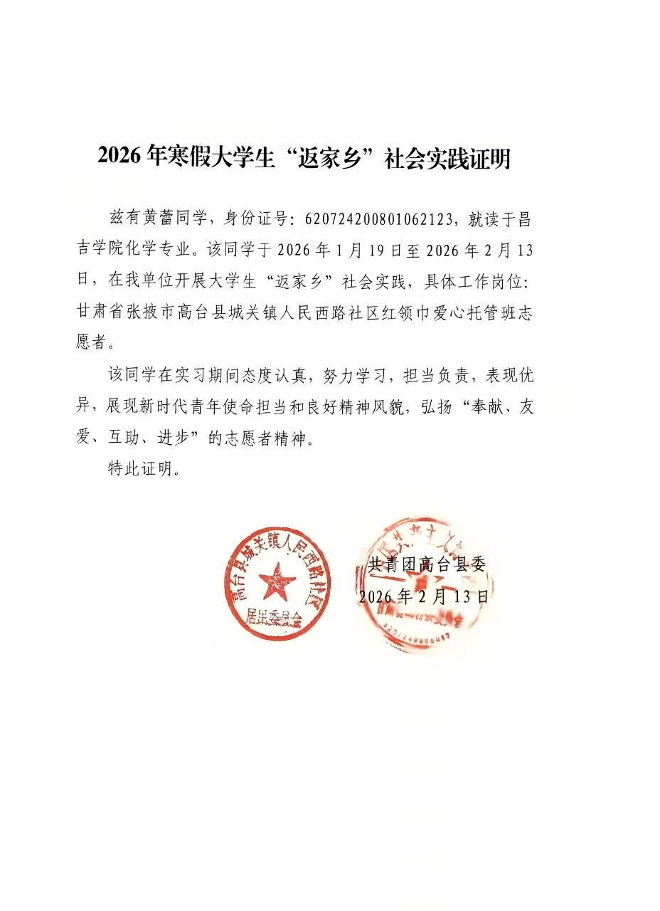 返家乡社会实践让我走出校园、深入社会,在实践中增长才干、锤炼品格。我懂得真正的成长在于脚踏实地、扛起责任。今后我会继续参与志愿服务,以青春践行担当,在奉献中绽放光彩。