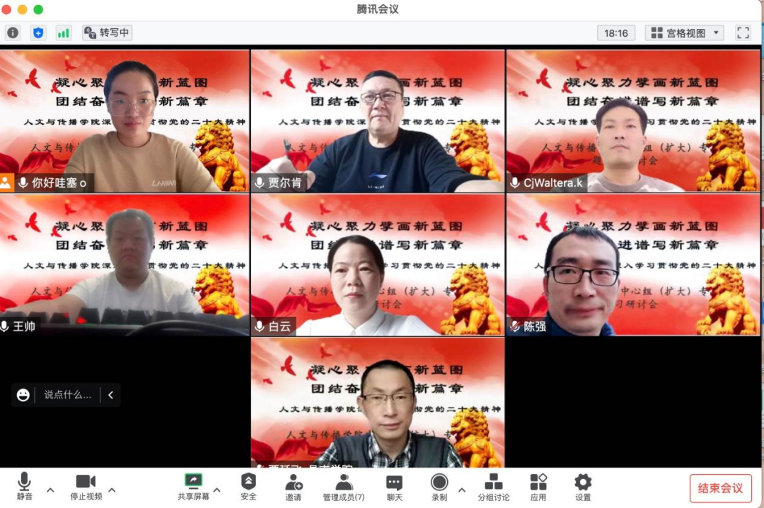 人文与传播学院党总支理论学习中心组(扩大)召开线上会议,以“凝心聚力擘画新蓝图,团结奋斗谱写新篇章”的为主题开展专题学习。会上,副院长贾延飞同志原原本本、逐字逐句领学了党的二十大报告。会议指出学习宣传贯彻党的二十大精神是当前和今后一段时间的首要政治任务,全院教职工要提高站位,精学细悟,扎实推动党的二十大精神的学习研究宣传全覆盖。学院副院长陈强同志、学院党总支副书记贾尔肯·安沙尔、学院副院长白如金同志分别结合分管工作做了交流研讨发言。