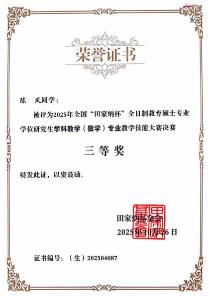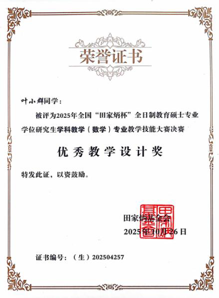 近日,2025年全国“田家炳杯”全日制教育硕士专业学位研究生学科教学(数学)专业教学技能大赛(决赛)圆满落幕。在银龄教授韦俊老师指导下,昌吉学院数学与数据科学学院学科教学(数学)专业2023级研究生陈凤荣获全国三等奖,2023级研究生龚馨、叶小群荣获全国优秀教学设计奖。