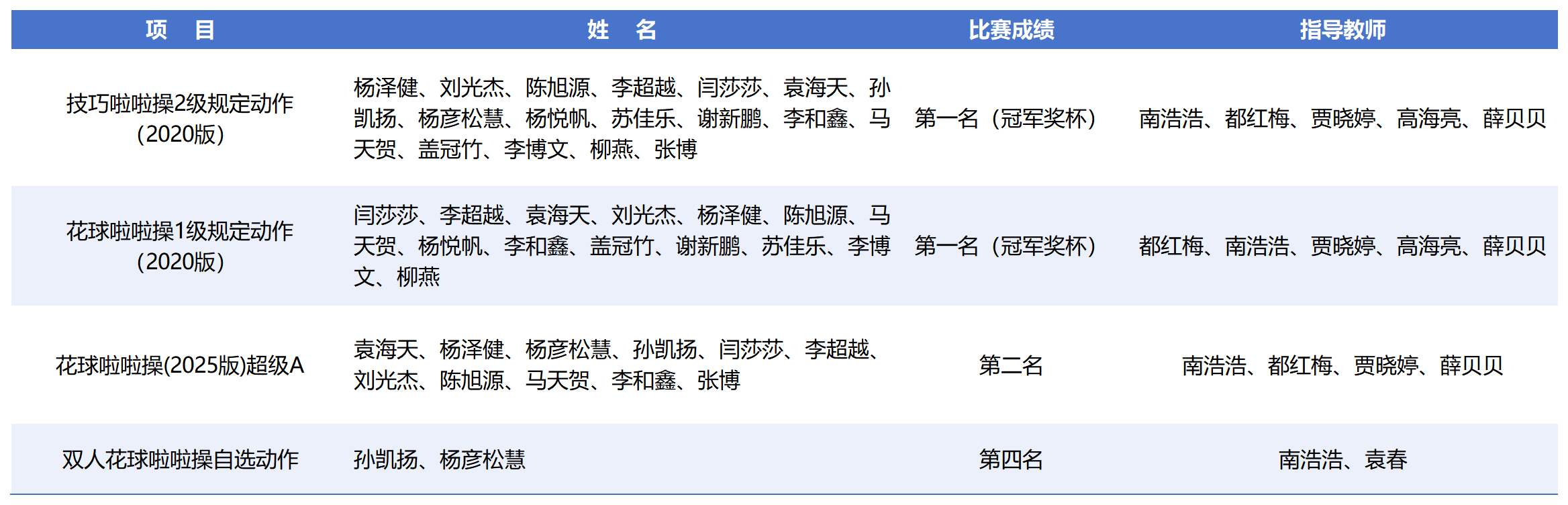 本次赛事由国家体育总局体操运动管理中心、中国蹦床与技巧协会联合主办,吸引了全国 68 支队伍、1600 余名运动员参赛。我校学子在技巧啦啦操、花球啦啦操等项目角逐中,不仅生动展现了蓬勃进取、勇于拼搏的精神风貌,更集中体现了学校深化教学改革创新、推动内涵式高质量发展的显著成效。