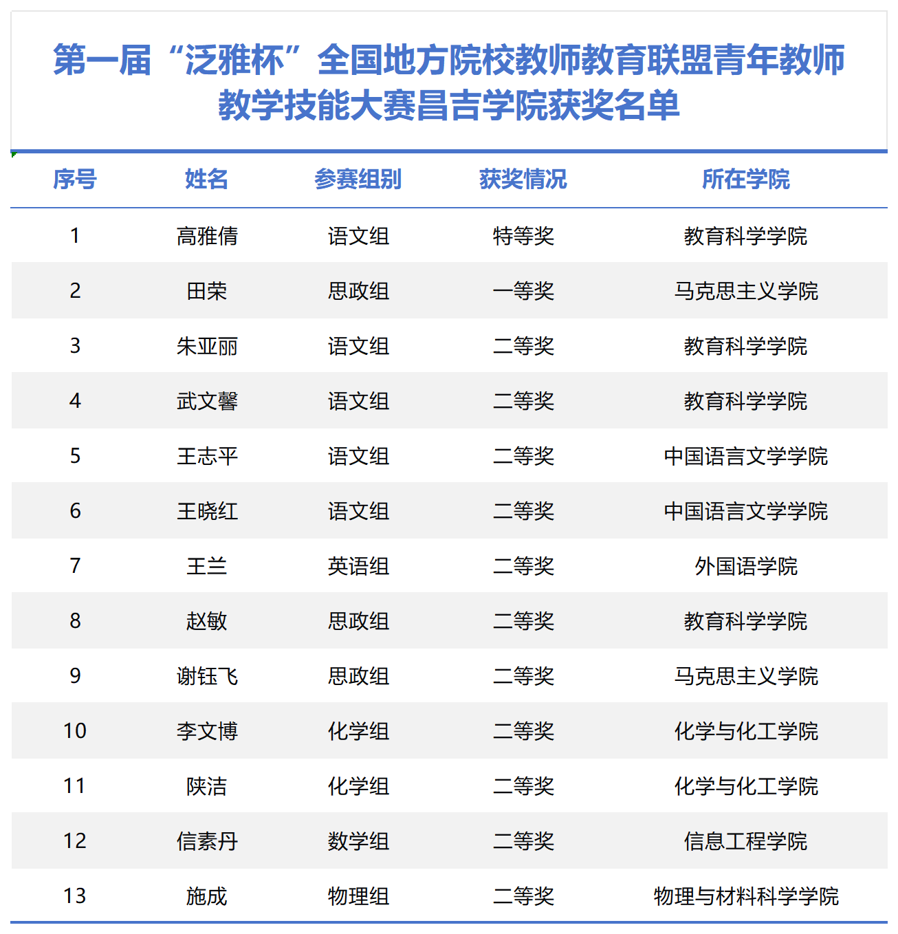 近日,第一届“泛雅杯”全国地方院校教师教育联盟青年教师教学技能大赛获奖名单公布,我校教师共斩获13个奖项,其中高雅倩荣获特等奖,田荣荣获一等奖,朱亚丽等荣获二等奖;昌吉学院获得优秀组织奖。