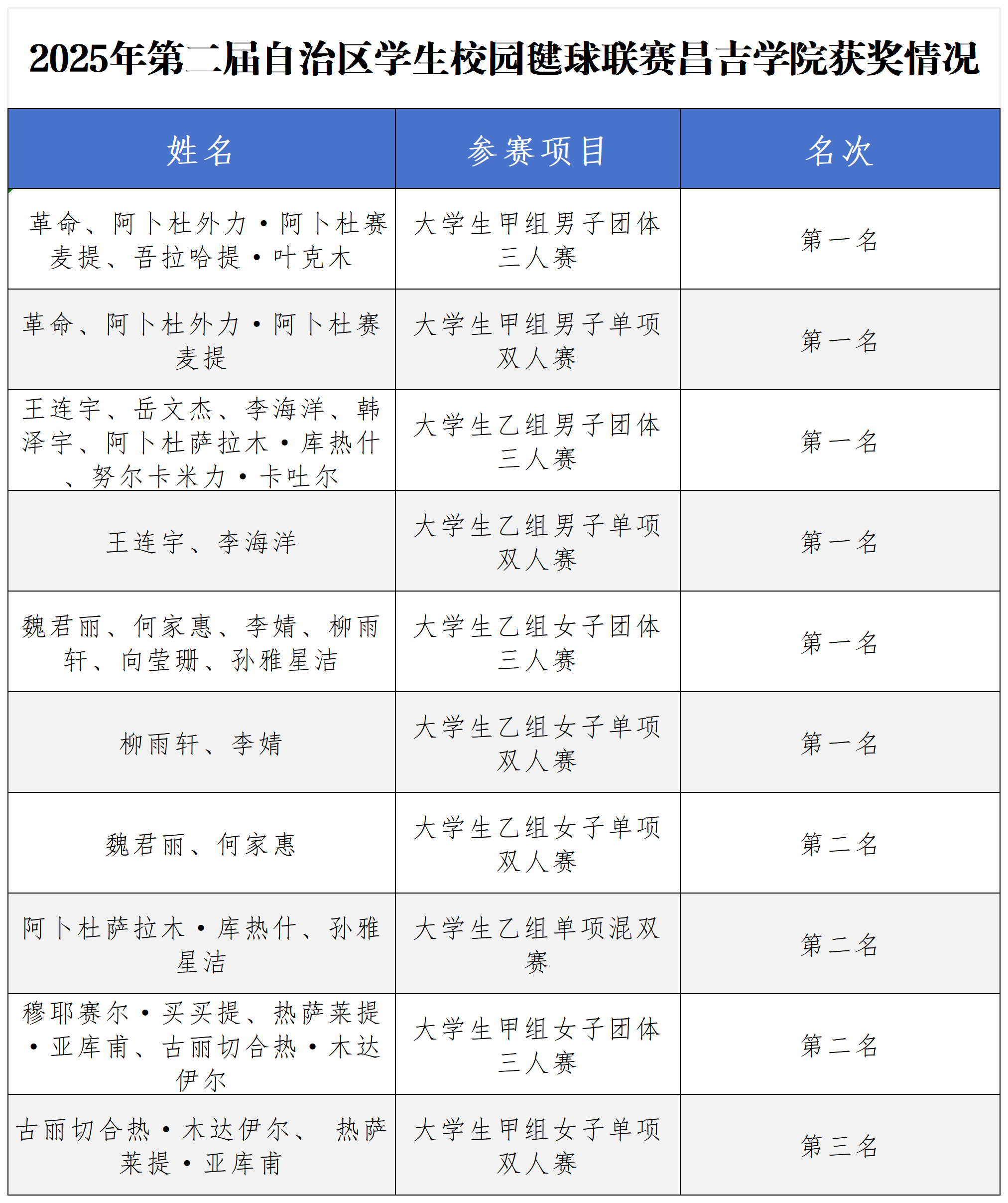 本届联赛由自治区教育厅主办,新疆学生体育协会执行,比赛吸引了来自全疆各高校的18支大中学生代表队181名选手参赛。赛事历时3天,设大学生甲组、乙组、丙组及中学生组4个组别。此次获奖是我校体育教学创新成果的综合体现,也是学校持续推进教育教学改革、深化内涵式高质量发展的生动展示。