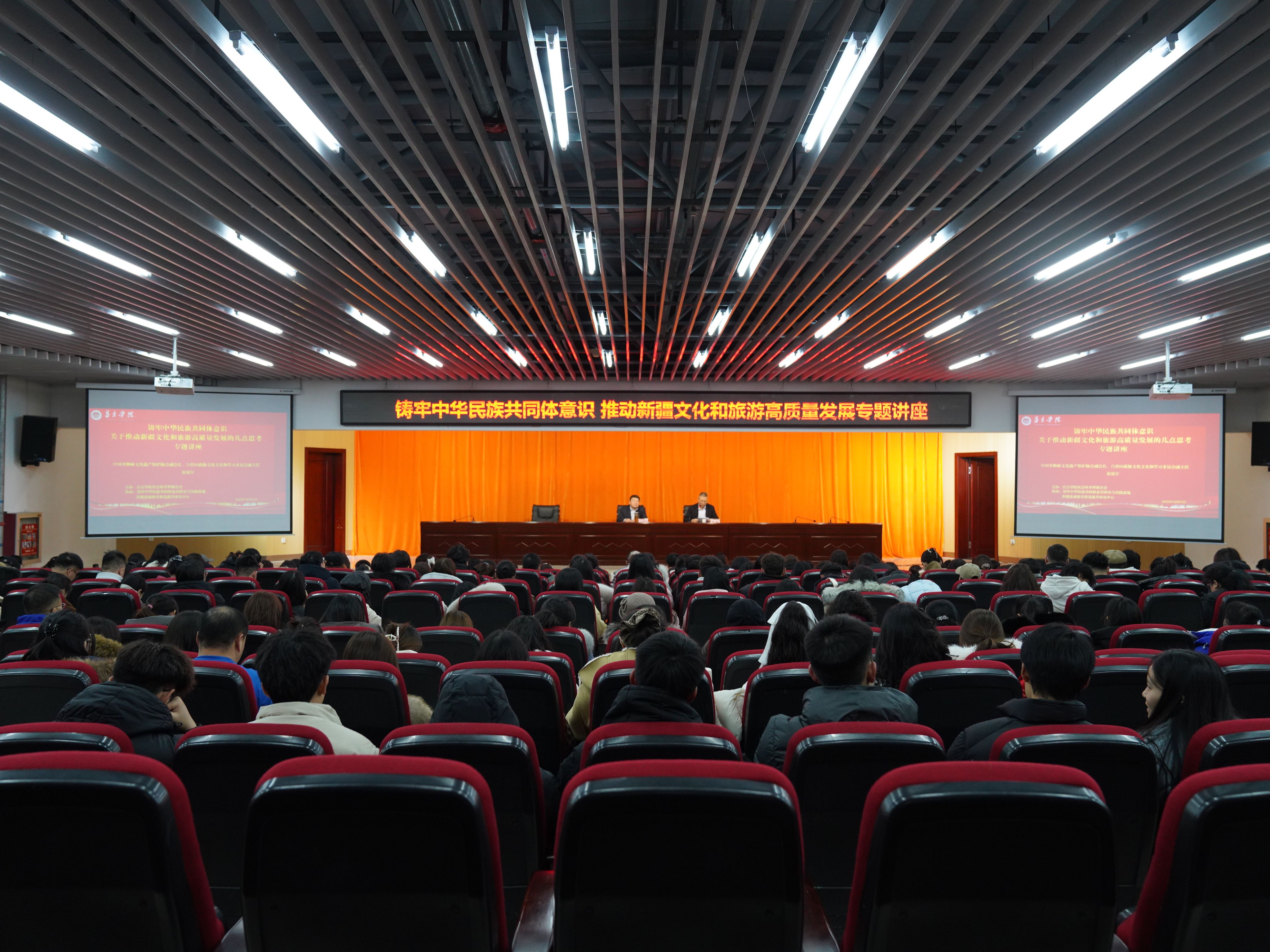 徐锐军围绕《铸牢中华民族共同体意识 推动新疆文化和旅游高质量发展》主题,详细介绍了新疆文化和旅游资源的独特区位优势和近年来取得的成绩,系统阐述了文化和旅游融合发展对促进民族团结、推动经济社会发展、增强文化自信的重要作用。他指出,新疆作为多元文化交汇之地,各民族共同缔造了统一的多民族国家,创造了灿烂的中华文化,培育了伟大的民族精神。新疆文化和旅游行业不仅是新疆优势产业集群之一,更是推进铸牢中华民族共同体意识,展示新疆各民族和谐发展形象的窗口。昌吉学院能够依托自身学科专业优势与平台资源优势,在人才培养、学术研究、社会服务等领域主动作为,紧密对接自治区文化和旅游产业发展需求,为新疆文旅高质量发展贡献了智慧与力量。