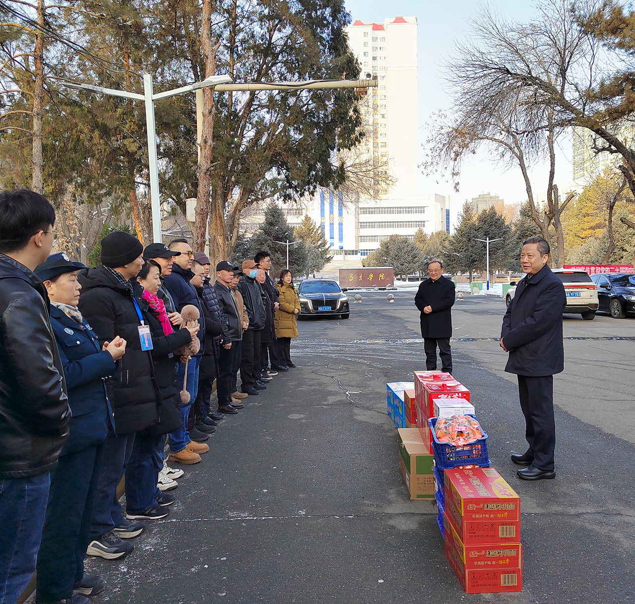 罗旭与塔布斯·别金、刘彦平、马骁骊等校领导分别慰问了园丁校区和新城校区春节期间值班人员。