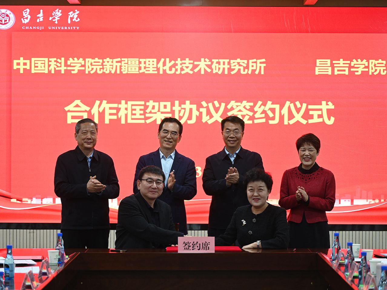 签约仪式上,中国科学院新疆理化技术研究所副所长任晓光与杨莲红分别代表中国科学院新疆理化技术研究所和昌吉学院签署全面战略合作协议。罗旭、季荣、潘世烈、刘小龙共同见证签约过程。