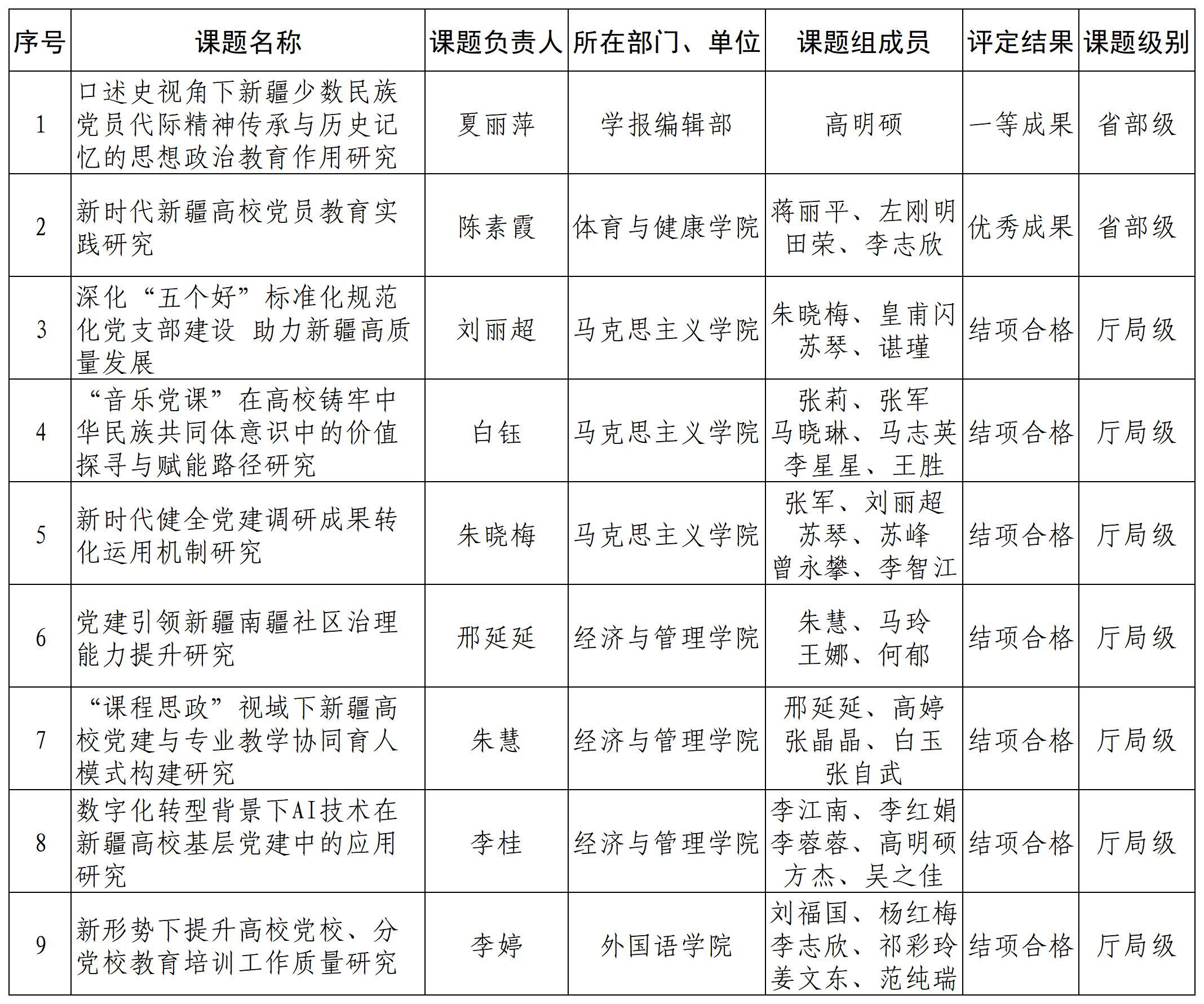 近日,新疆党建研究会公布2025年度党的建设和组织工作优秀课题成果等级评定情况和调研课题结项情况,学校1项课题荣获一等成果奖,1项课题荣获优秀成果奖,其余申报的7项课题均顺利通过结项评审。