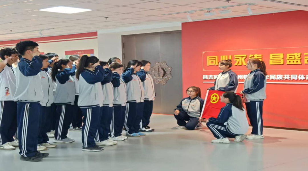 在昌吉州铸牢中华民族共同体意识主题馆,B2501班级团支部的团员们以青春之姿,赴一场信仰之约。整齐列队,面向团旗,他们庄严敬礼、宣誓。
