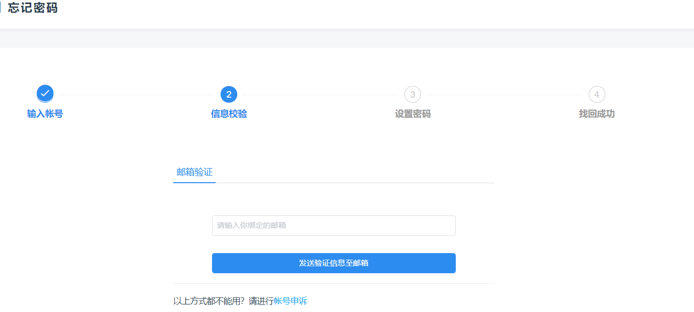 在用户登录页面,点击“忘记密码”后,弹出密码找回个人自助服务页面,用户可以根据提示,根据之前绑定的个人邮箱进行密码找回!