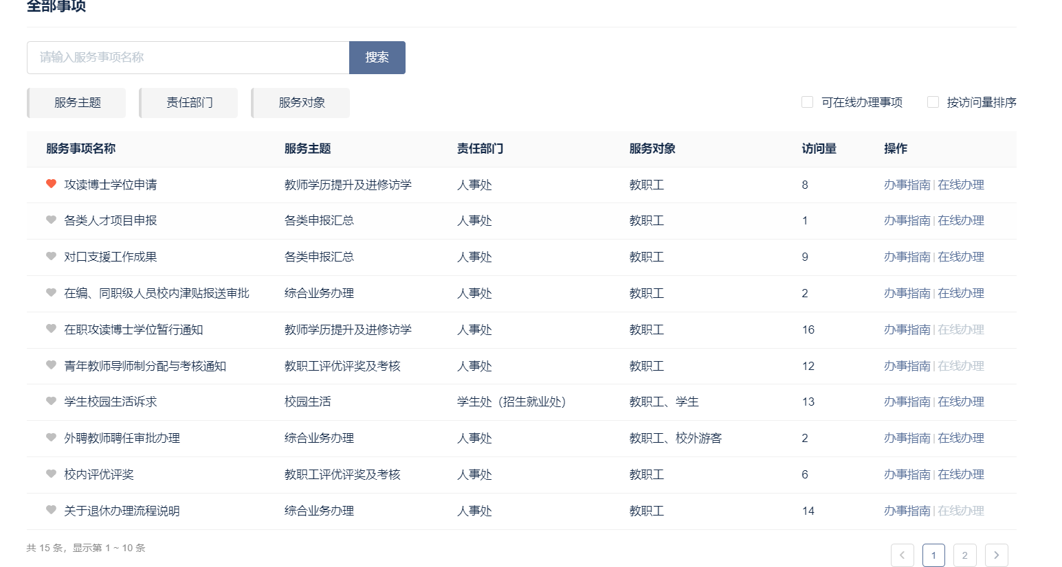 页面只包含与教职工相关的事项应用,OA通知公告,办理统计,全部事项,热门事项,OA办公系统,人事及继续教育学生管理系统等内容,也是广大教职工主要访问办事的页面。