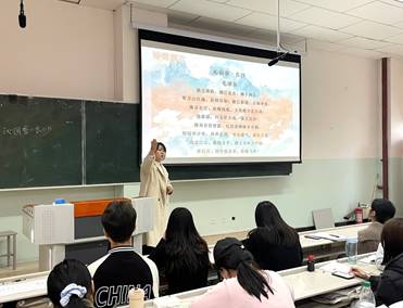 蔡玲同学讲授的篇目是《蒹葭》,选手以“伊人形象”为核心,用数学、生物、物理等跨学科思维阐释“伊人是谁”,将“伊人”升华为人类共通的理想,完美实现了古诗鉴赏与生命教育的深度融合。