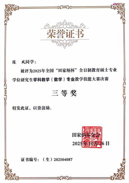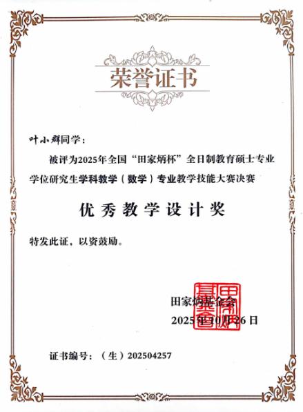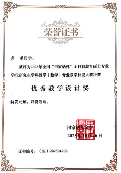 近日,2025年全国“田家炳杯”全日制教育硕士专业学位研究生学科教学(数学)专业教学技能大赛(决赛)在西华师范大学圆满落幕。在银龄教授韦俊老师指导下,昌吉学院数学与数据科学学院学科教学(数学)专业2023级研究生陈风荣获全国三等奖,2023级研究生龚馨、叶小群荣获全国优秀教学设计奖,充分展现了我院教育硕士研究生扎实的专业素养、优秀的教学设计能力和良好的综合素养。