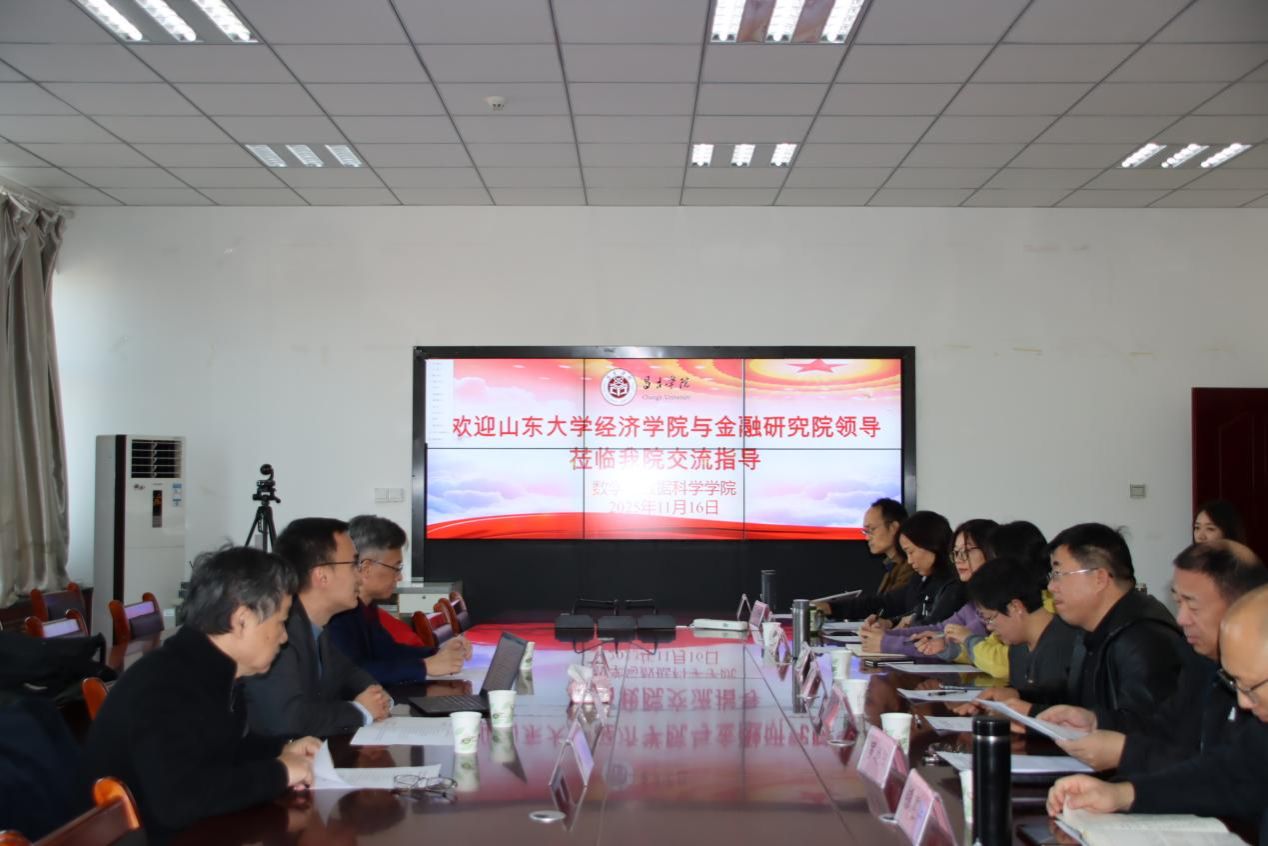 在山东大学对口支援昌吉学院20周年之际,山东大学经济学院党委书记朱子川、金融研究院林路、石玉峰教授一行于2025年11月16日来到昌吉学院数学与数据科学学院开展座谈交流。昌吉学院数学与数据科学学院党委领导班子成员及教研室主任、教师代表热情接待并开展座谈交流。座谈会由昌吉学院数学与数据科学学院党委书记刘福国主持。