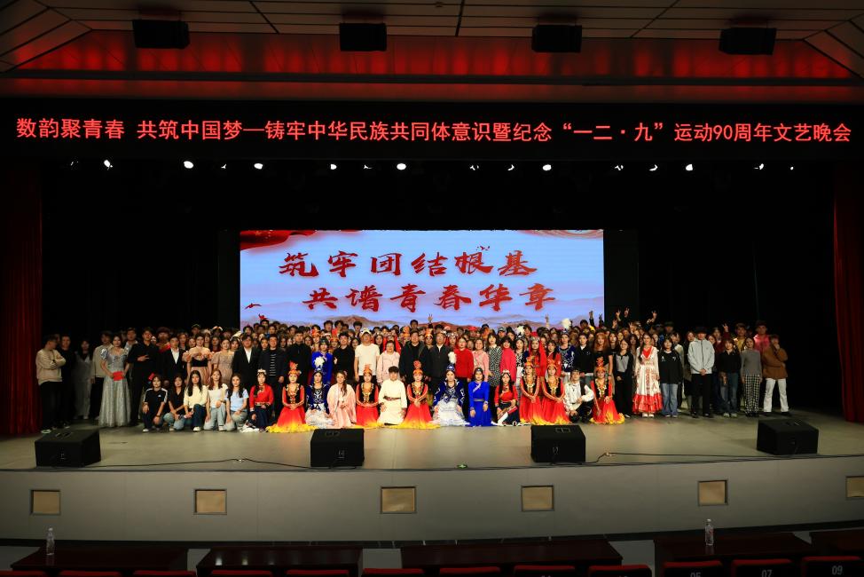 晚会围绕“铸牢中华民族共同体意识、致敬‘一二·九’运动90周年”主题,分为“数启新程·初见天山”“情谊交织·共赴韶华”“多彩中国·同心筑梦”三个篇章,在传承红色精神的同时,展现数科学子团结进取、昂扬向上的精神风貌。