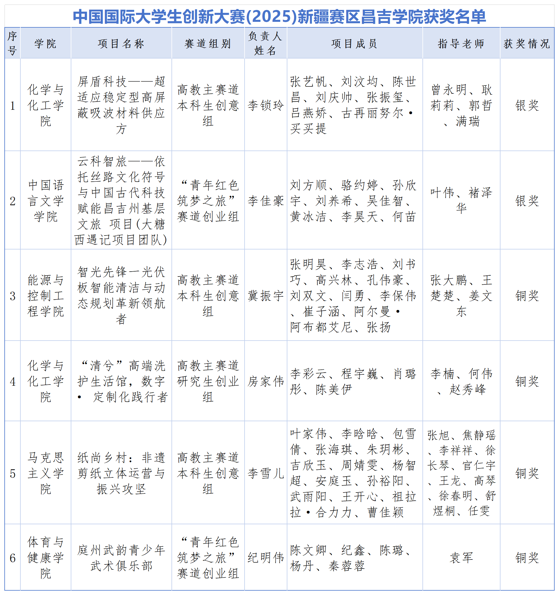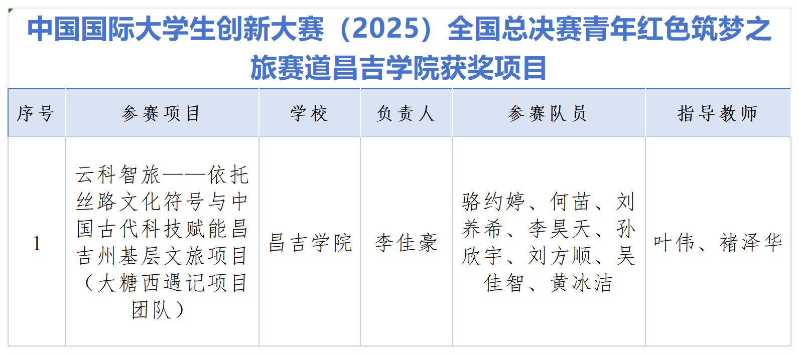 近日,中国国际大学生创新大赛(2025)组委会正式公示获奖名单。昌吉学院教师叶伟、褚泽华联合指导的项目“云科智旅——依托丝路文化符号与中国古代科技赋能昌吉州基层文旅项目”,在全国总决赛青年红色筑梦之旅赛道荣获铜奖;学校在新疆赛区斩获2项银奖、4项铜奖。
