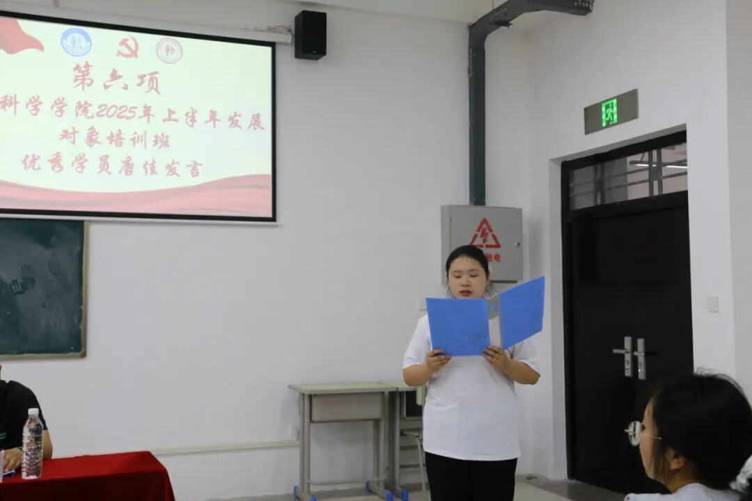 优秀学员代表、教育科学学院的唐佳同学在发言中向党组织和老师们的辛勤培养表达了衷心感谢,也感谢同学们的支持与帮助。她表示,作为党员发展对象,大家站在了政治生命的新起点上,入党不仅是身份的象征,更是一份沉甸甸的责任与使命。通过此次培训,大家深入学习了党的理论,深刻感悟到信仰的力量,增强了纪律意识。在今后的学习和工作中,将以更高的标准要求自己,以身作则,践行担当,争取早日成为一名合格的共产党员,为党和人民的事业贡献自己的力量