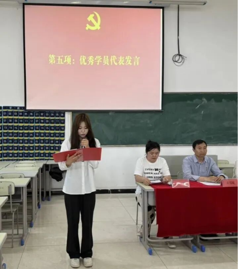 B2304班马静静代表优秀学员发言,她分享了自己在培训期间的学习心得和感悟。她表示,通过系统学习党的理论知识,自己不仅深化了对党的认识,更坚定了加入中国共产党的信念。在今后的学习和生活中,将以党员标准严格要求自己,发挥模范带头作用,为实现中华民族伟大复兴贡献力量。
