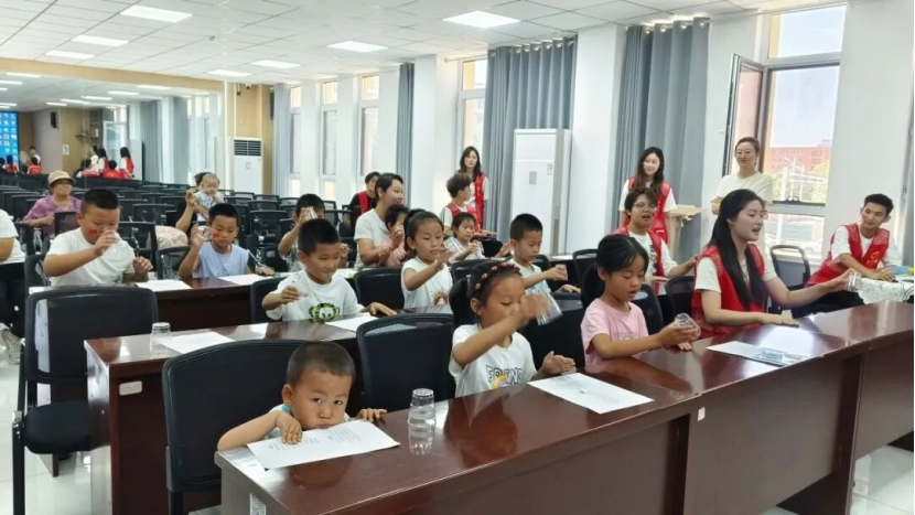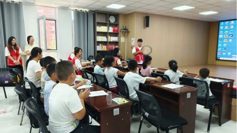 在“乐器筑基”工作坊活动中,实践团成员引导孩子们利用桌子和杯子敲打出《布谷鸟》的节奏,让孩子们感受到节奏的独特魅力与乐趣。当旋律通过生活器具奏响时,维吾尔族学生买吾兰用手鼓为其伴奏,多民族文化在节奏共鸣中交融。通过这一活动,孩子们不仅掌握了基础的音乐知识和节奏技巧,还在日常物品中发现了美感,提升了审美水平与创造能力,在心中播下了生活美育的种子,进一步强化了对文化的认同感与归属感。