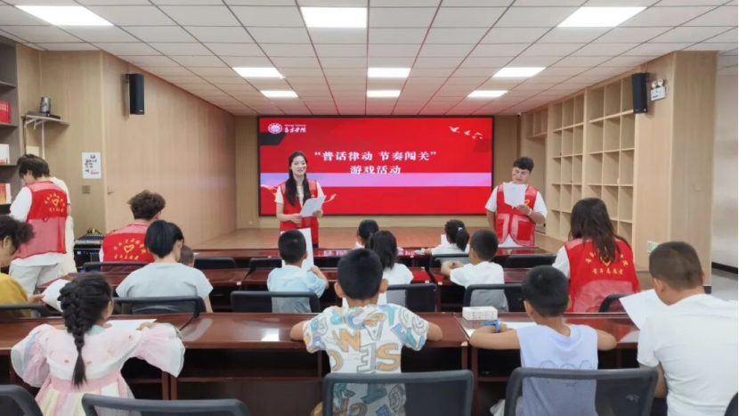 在“普话律动,节奏闯关”游戏环节,开展“绕口令节奏拍”和“音乐猜谜语”趣味活动,以音乐为纽带,将普通话学习与音乐节奏有机结合,并通过播放经典红歌片段,引导孩子们猜出歌名并用普通话准确作答,在轻松愉快的游戏氛围里,孩子们不仅提升了普通话水平,还在铿锵的节奏中深化了对红色文化的认知与热爱,进一步增强了文化自信和民族认同感。