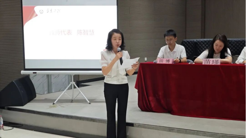 优秀教师陈智慧代表全体教师对新同学的到来表示衷心的欢迎,并从积极调整心态、明确学习目标、培育良好的自我管理能力、积极参加实践活动四个方面寄语新生,期望学生能牢记校训,在大学的时光里学有所获,不负韶华!